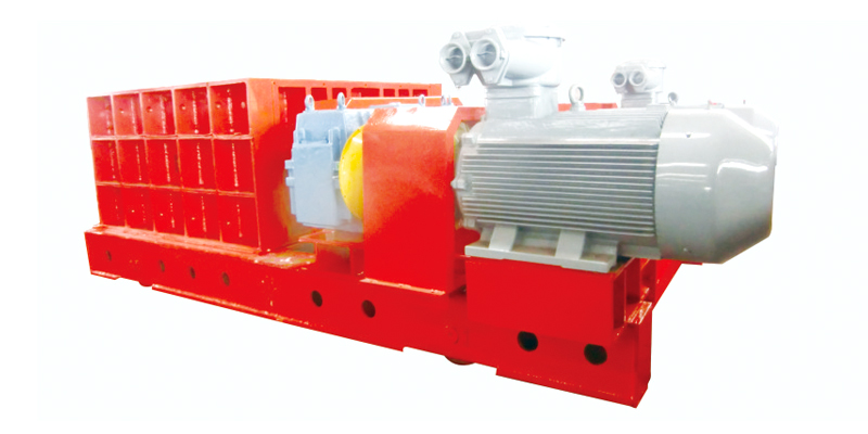 破碎機(jī)由兩臺(tái)電動(dòng)機(jī)將動(dòng)力經(jīng)減速器減速后分別驅(qū)動(dòng)兩齒輥相向旋轉(zhuǎn),當(dāng)物料從入料口進(jìn)入機(jī)體破碎腔時(shí),帶有螺旋齒牙的兩齒輥首先將物料篩分,符合要求的物料通過齒間進(jìn)入排料溜槽。大塊物料受齒輥齒牙的劈裂、剪切,